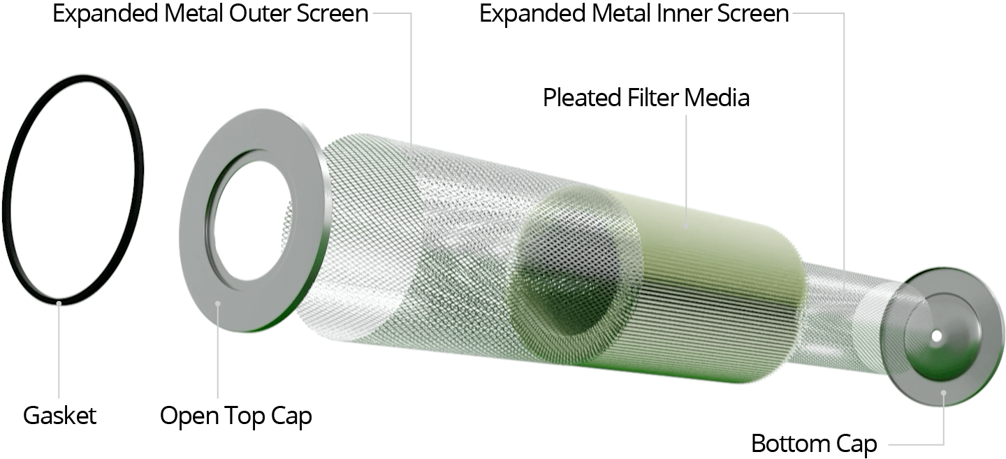Outer bands are used to protect the filter pleats from disturbance during the cleaning cycle. We supply filters with as few as 1 band and up to 5 outer bands depending on the length of the filter. Fab-Tex can also swap out metal exterior screens for 1 or more outer bands for easy cleaning and release in reclaim systems.